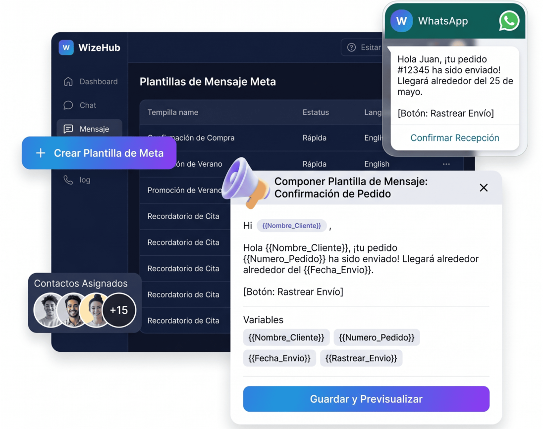 Conecta tu número verificado, envía plantillas HSM precargadas, recibe mensajes instantáneamente. WizeHub maneja toda la complejidad técnica para que tú solo configures y lanzes.